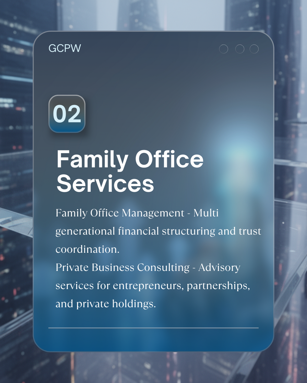 Rooted in integrity and defined by discretion, our mission is to help clients protect, manage, and grow their wealth through thoughtful planning, disciplined management, and a long-term vision.